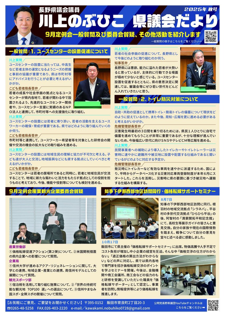 『川上のぶひこ県議会だより2025秋号』を飯田市・下伊那郡の新聞に折り込みます。